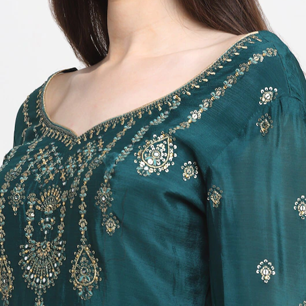 Green & Silver-Toned Embellished Unstitched Dress Material