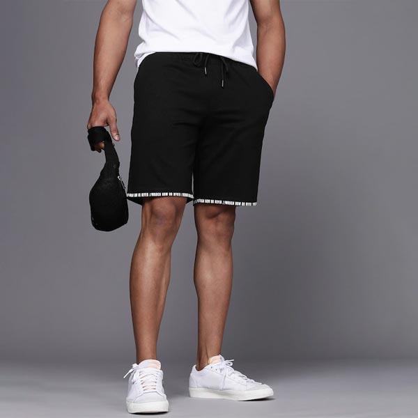 Black typography printed mid-rise regular shorts, has 4 pockets, drawstring closure